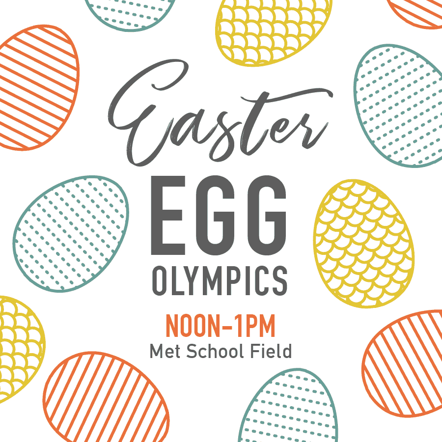 All kids attending on Easter will receive a bracelet for free entrance into the Easter Egg Olympics at the Met School field for kids ages 1-11. Check in begins at 11:45 and the games will be noon-1. Healthy snacks will be provided and prizes will be non candy items.